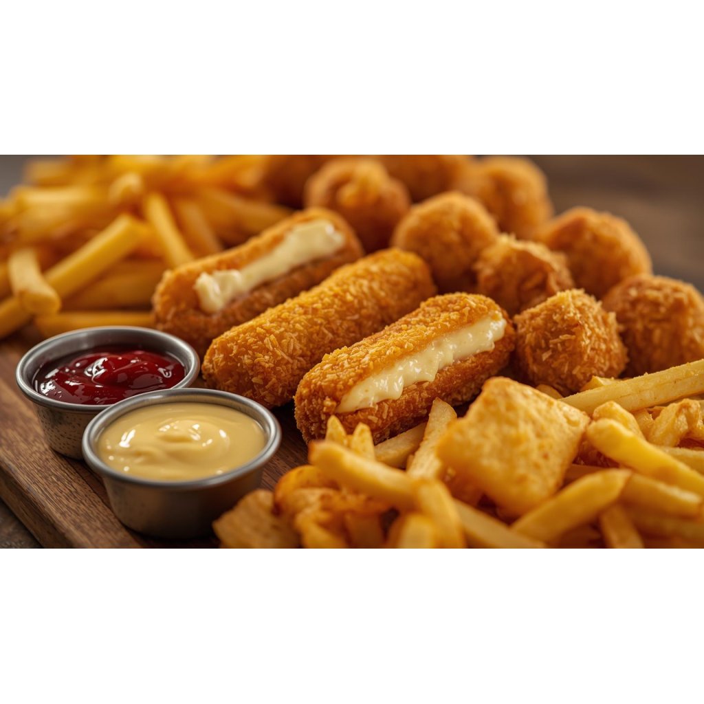 4ks smažačků 4ks smažených camembertíčků 4ks smažených mozzarellových tyčinek 4ks smažených nachos sýrových trojhránků 200g belgických hranolek, česneková omáčka, brusinková omáčka.