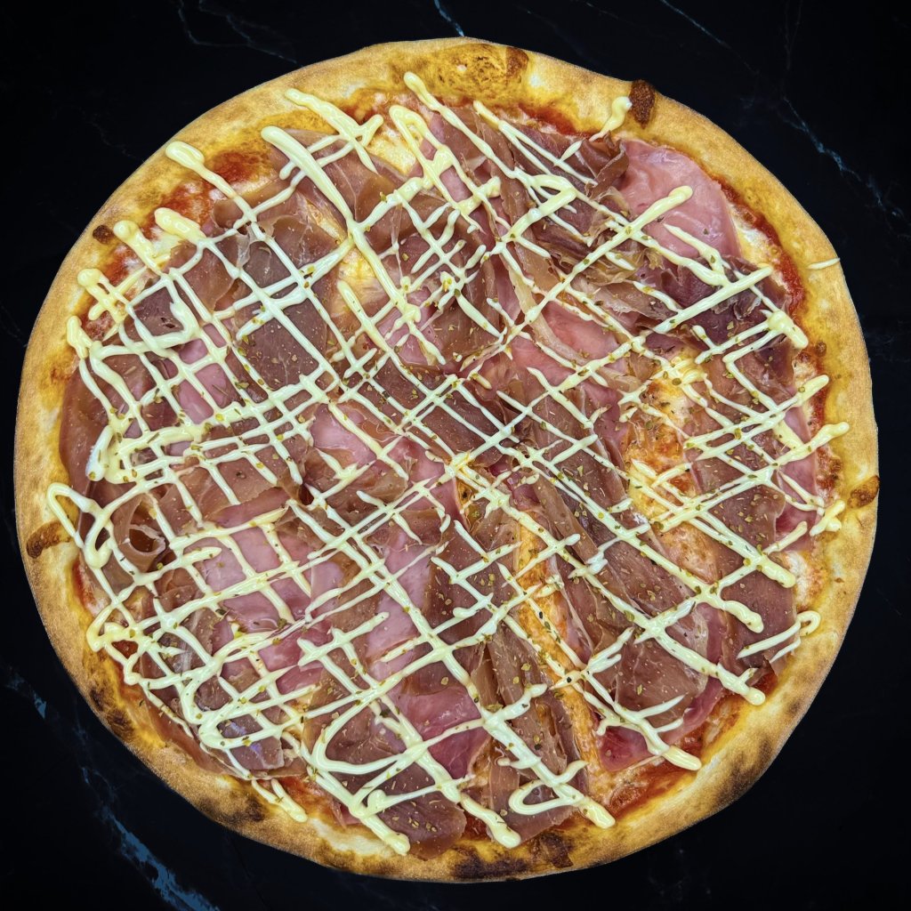 tomato, mozzarela, šunka, parmská šunka, domácí česnekový dresink, oregano