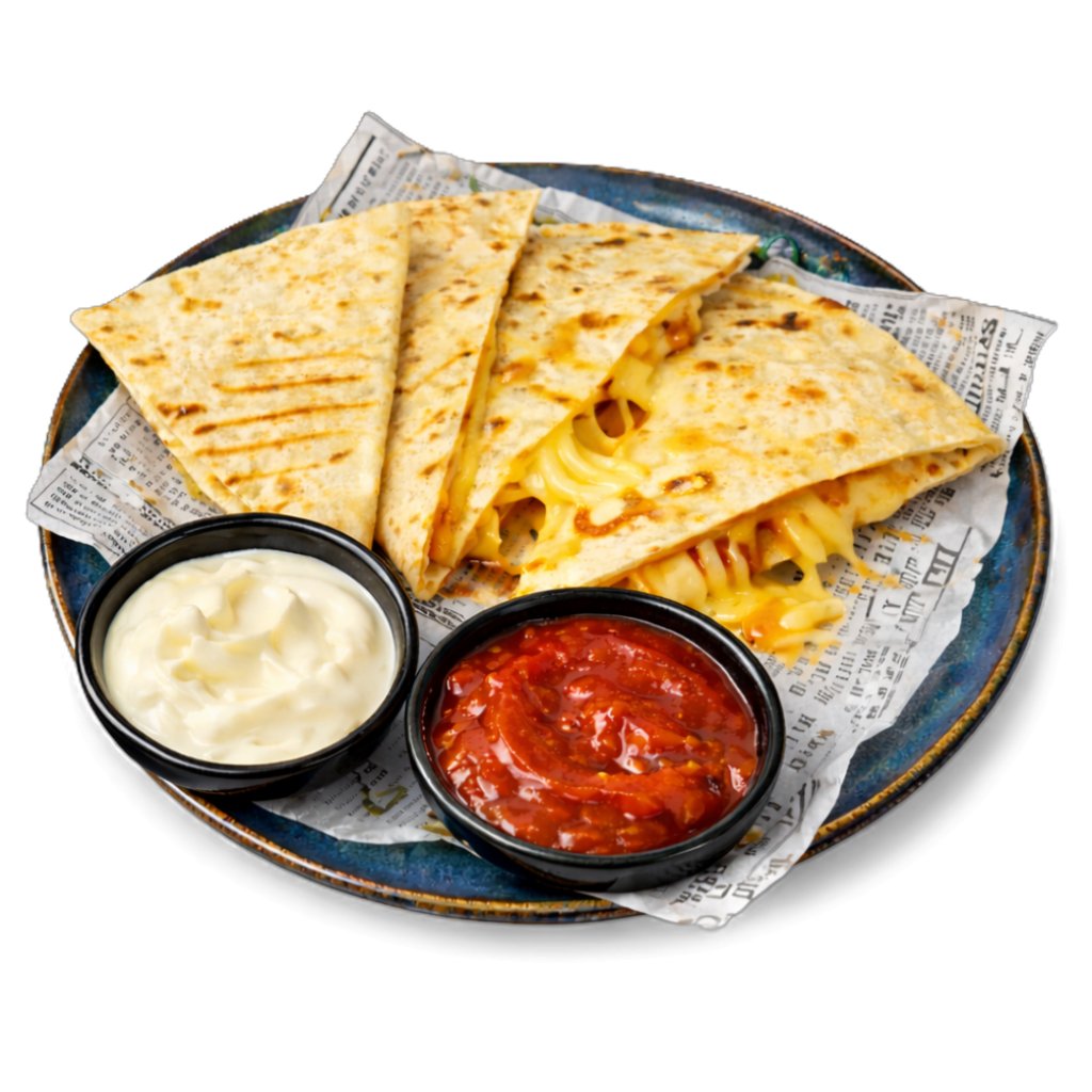 Tortilla, mozzarella, sýr s bílou plísní, čedar, rajčatová salsa a zakysaná smetana.