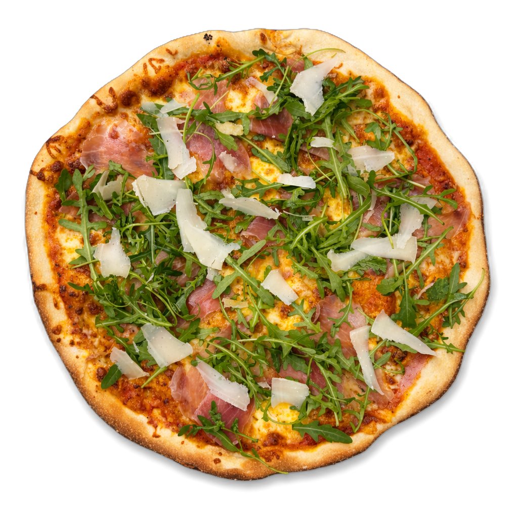 Tomat, mozzarella, prosciutto, rukola, sýr parmazánového typu.