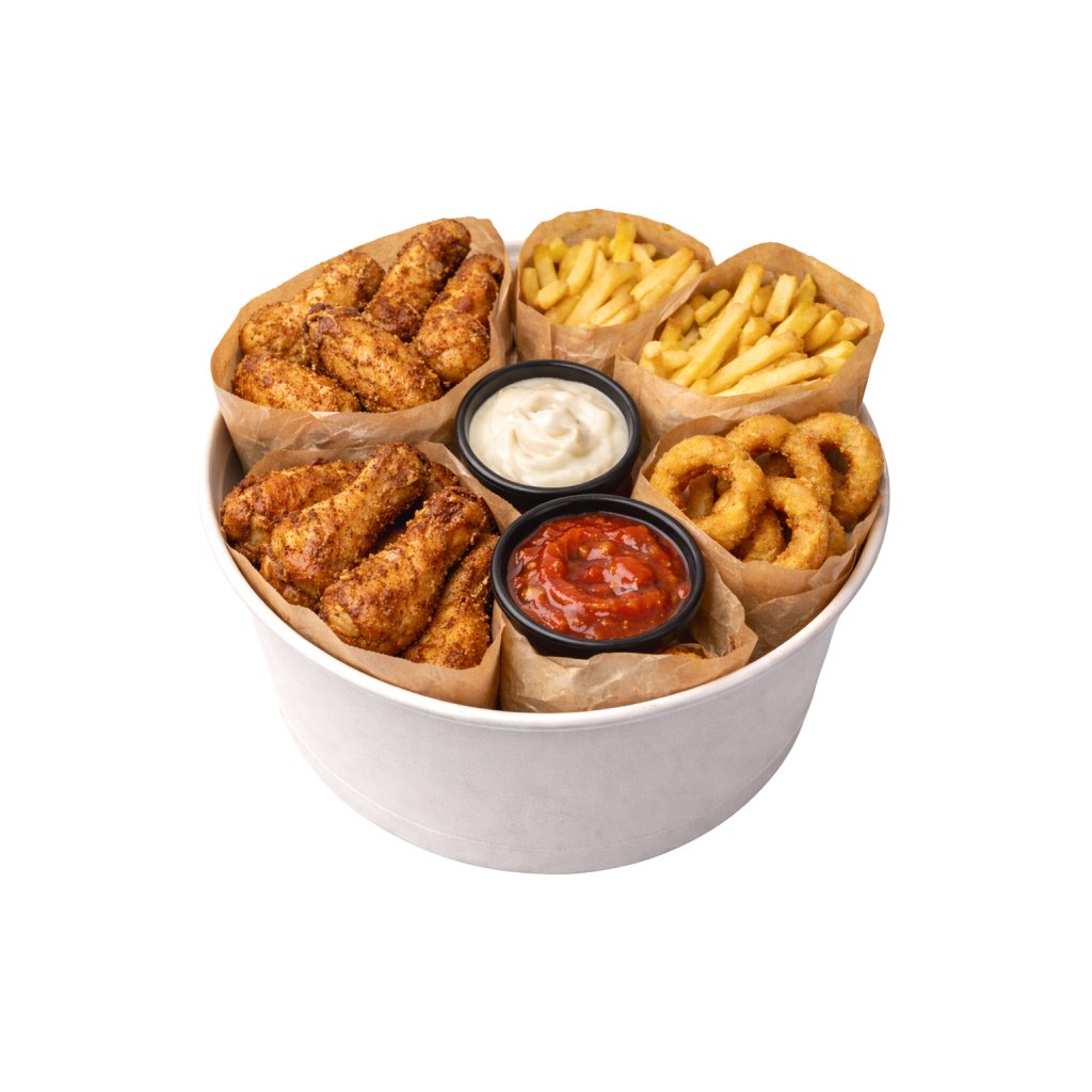 600g Pikantních křidélek, 2X 150g hranolek, 2X 6ks cibulových kroužků a dvě omáčky dle vlastního výběru