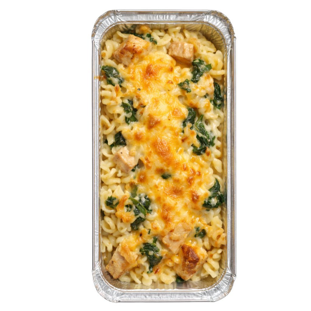 Těstoviny, špenát, kuřecí maso, česnek, smetana a čedar.