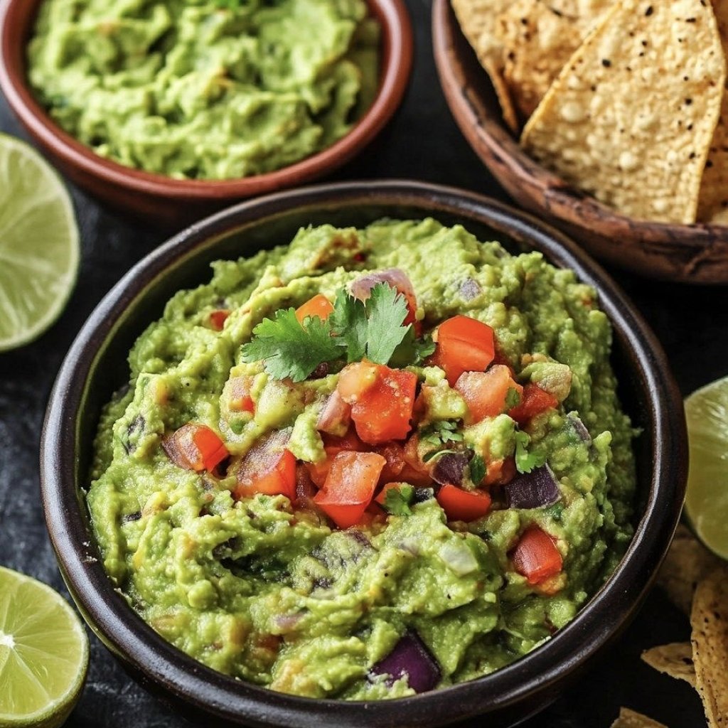 Tradiční avokádový dip s limetkou, cibulí a koriandrem, podávaný s křupavými kukuřičnými chipsy.