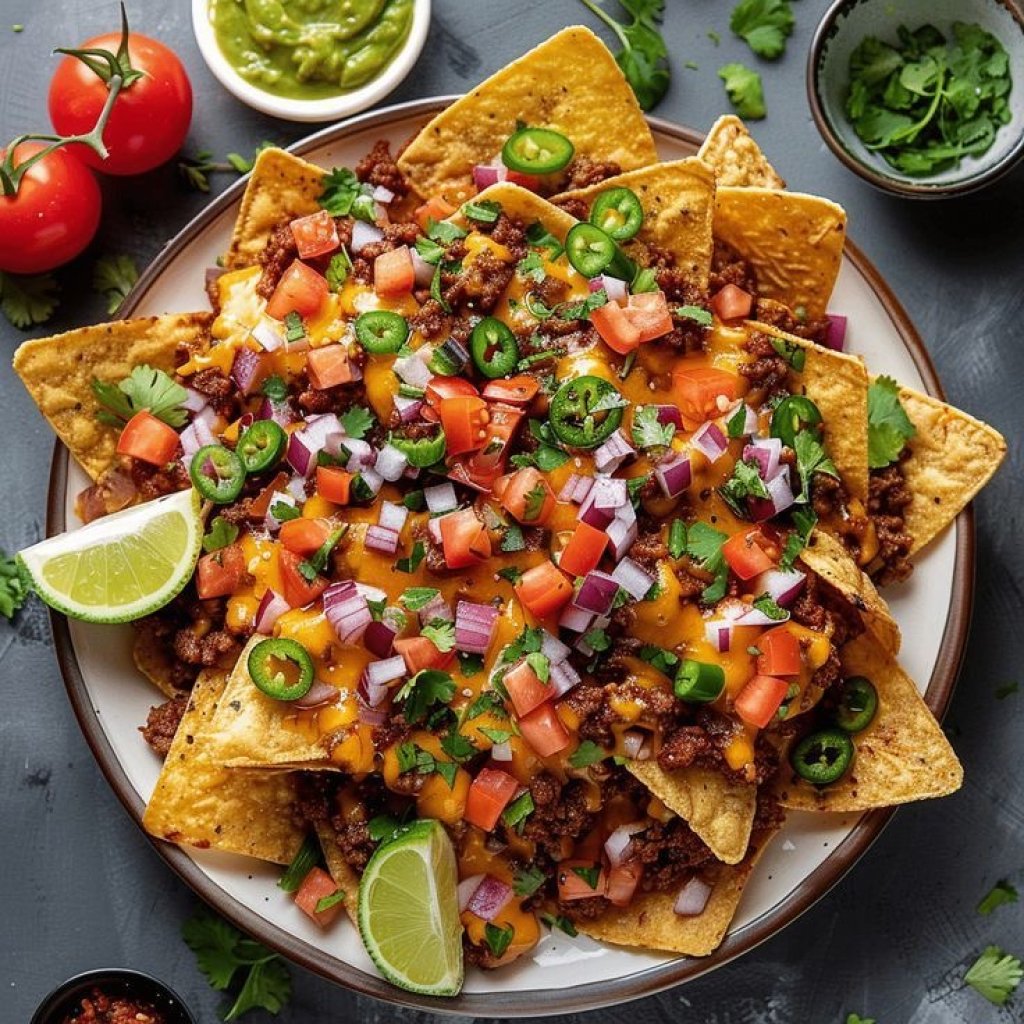 Kukuřičné chipsy se sýrovou omáčkou, mletým hovězím masem a jalapeños.