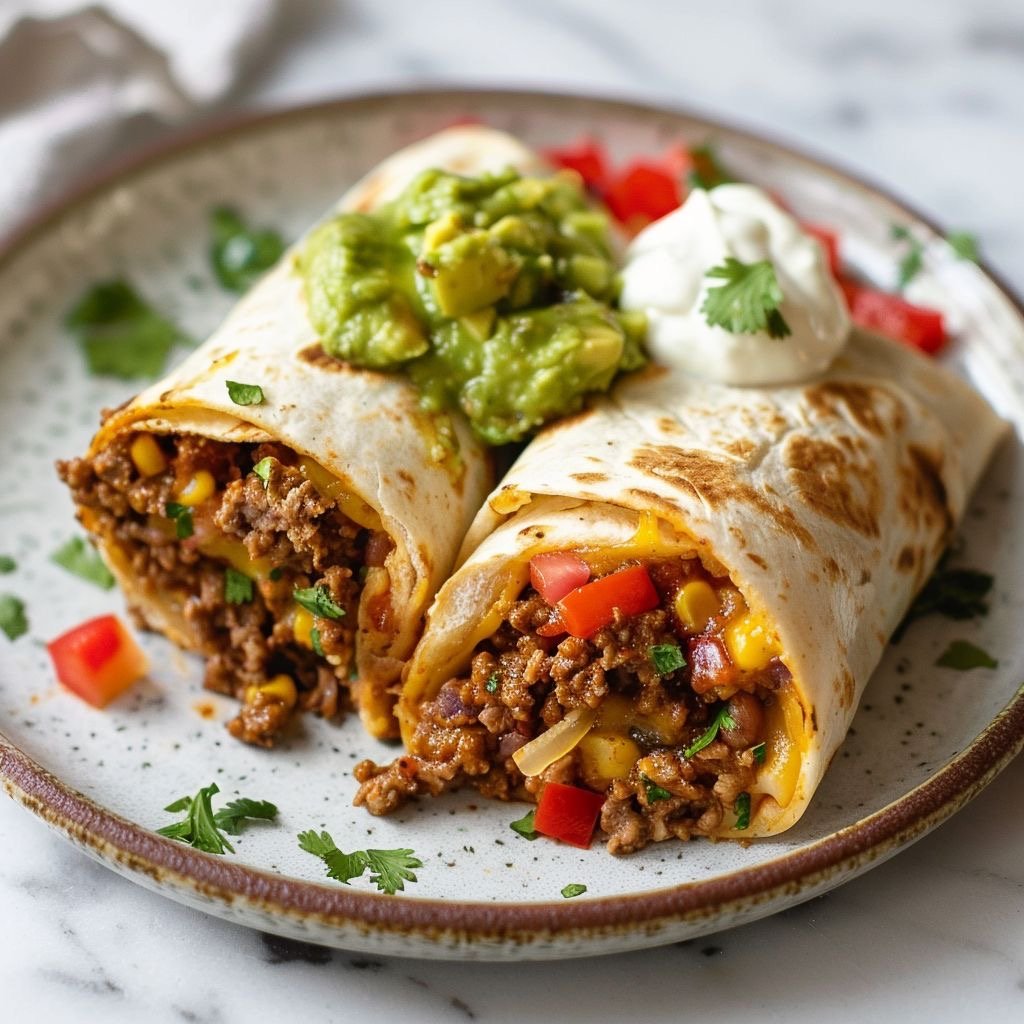 Velká tortilla plněná hovězím masem, fazolemi, rýží a sýrem, servírovaná s pikantní salsou.