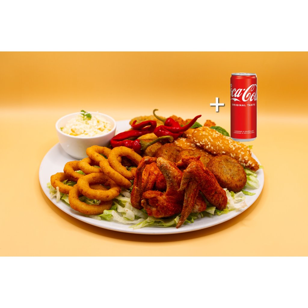 Pořádná nálož pro velký kluky - kuřecí stripsy, thajské stripsy, kuřecí křidélka, bramboráčky, cibulové kroužky, smažené plněné papričky Jalapenos, pepřový dresing, bbq dresing a salát coleslaw a coca-cola v plechu