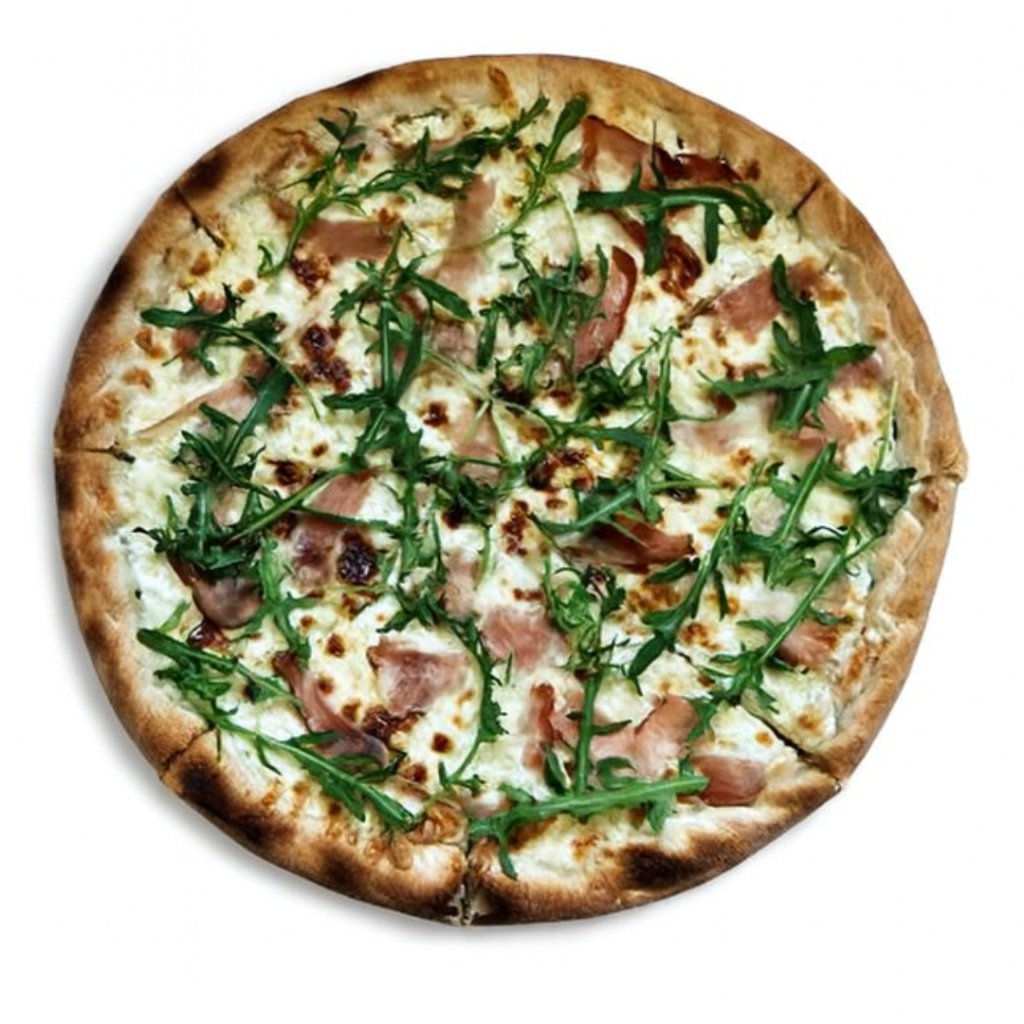 smetanový základ, sýr, schwarzwaldská šunka, rukola, oregáno