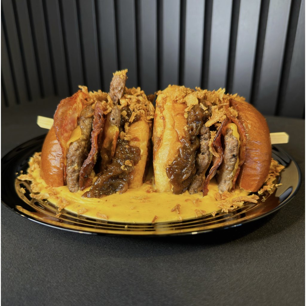 2x 90g hovězí chuck roll, vypečená bunska, cibulové chutney, uzený sýr, slanina, naše domáci burger mayo, to vše ponořené do naší domácí čedarové omáčky