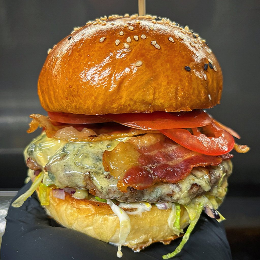 Bulka grilovaná na másle, mleté hovězí(100g), anglický sýr s modrou plísní Blue Clawson Stilton, slanina, rajče, cibule, salát, omáčky (bbq, medová majonéza a hořčičný dip)