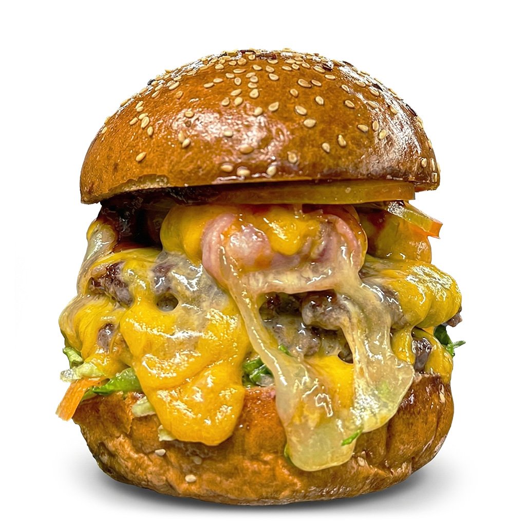 Bulka grilovaná na másle. 2x mleté hovězí(100g), 3x tvargle, slanina, čedar, rajčátka, salát, cibule, omáčky (bbq, medová majonéza a hořčičný dip).