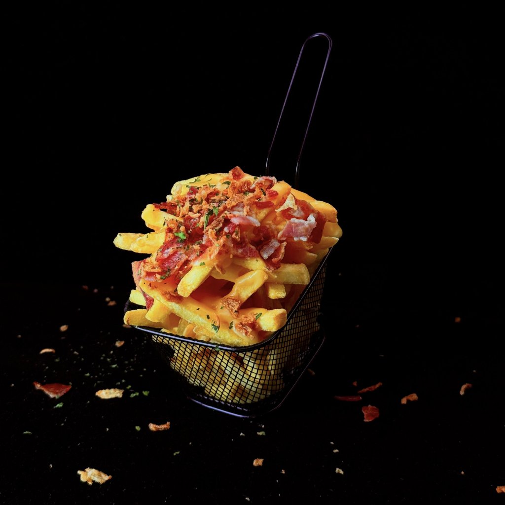 Hranolky zalité čedarovou omáčkou, smažená pancetta s cibulí, petržel.