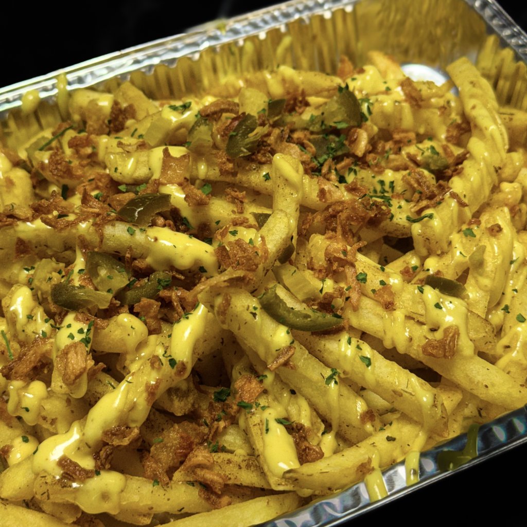 Velká porce hranolků, s domácim dresinkem, křupavou cibulí, jalapeños a petržel.