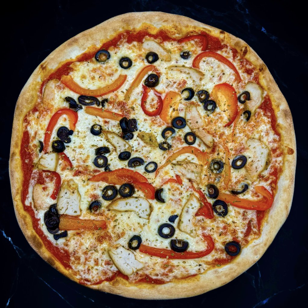 tomato, sýr (40% mozzarela), kuřecí maso, olivy, paprika, oregano