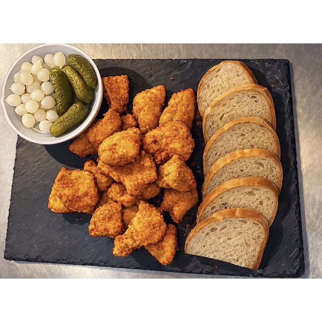 na prkénku, kuřecí a vepřové maso, nakládané cibulky, kyselý okurek, chléb