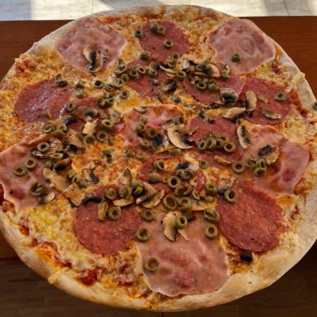 rajčatová směs, sýr, šunka, žampióny, olivy