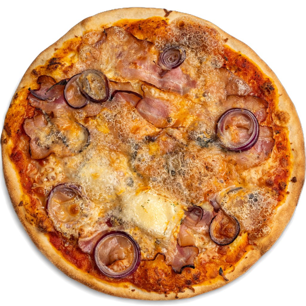 Tomat, mozzarella, slanina, cibule, tvarůžky.