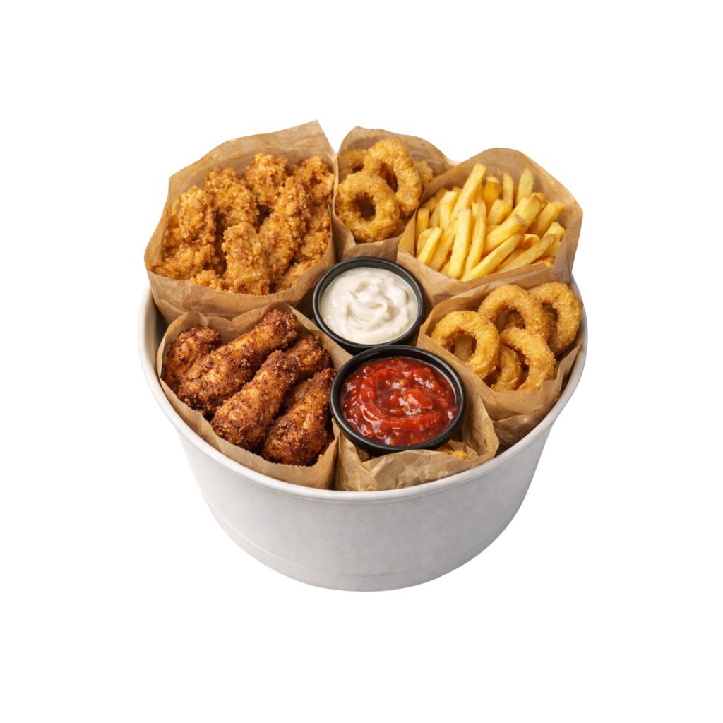 300g domácích stripsů, 300g pikantních křidélek, 2X 150g hranolek, 2X 6ks cibulových kroužků a dvě omáčky dle vlastního výběru.