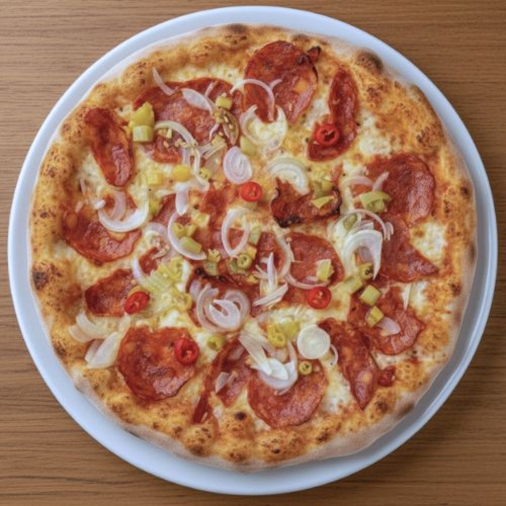 Rajčata - sugo, mozzarella, pikantní italský salám, cibule, vejce, feferonky, oregáno Tomato - sugo, mozzarella, hot italian salami, onion, egg, peppers, oregano