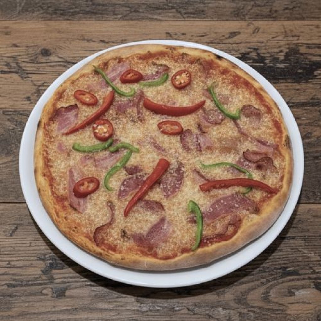 Rajčata - sugo, slanina, mozzarella, papriky, feferonky, parmezán, česnek, oregáno Tomato - sugo, bacon, mozzarella, green and hot peppers, parmesan, garlic, oregano