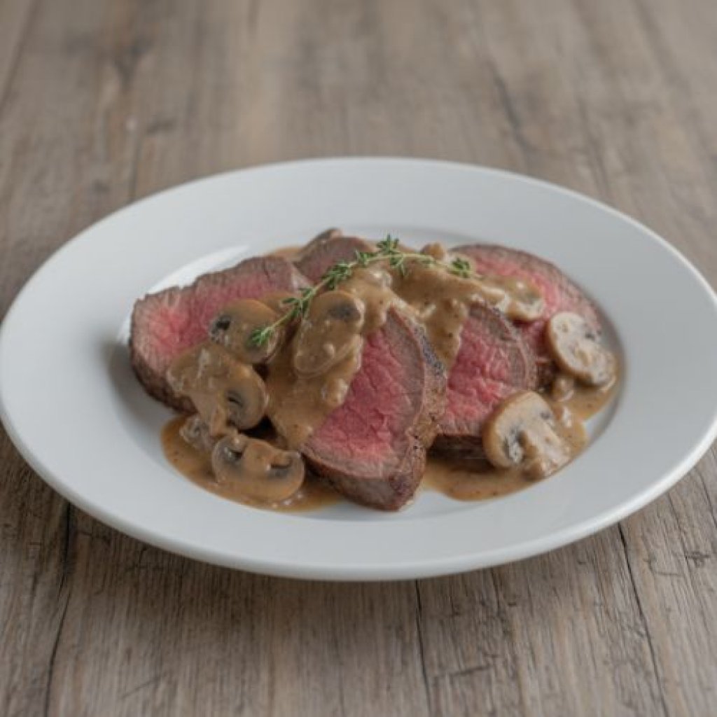 Plátky hovězí svíčkové s dušenými hříbky a smetanovou omáčkou Grilled fillet sirloin, stewed mushrooms, cream sauce