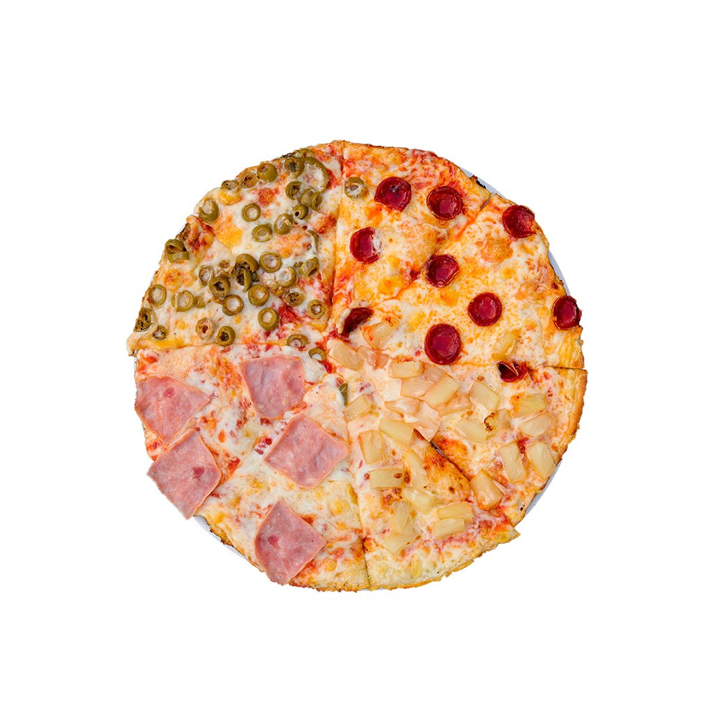 tomato, sýr, šunka, klobása, ananas, olivy (rozděleno na 4 díly)