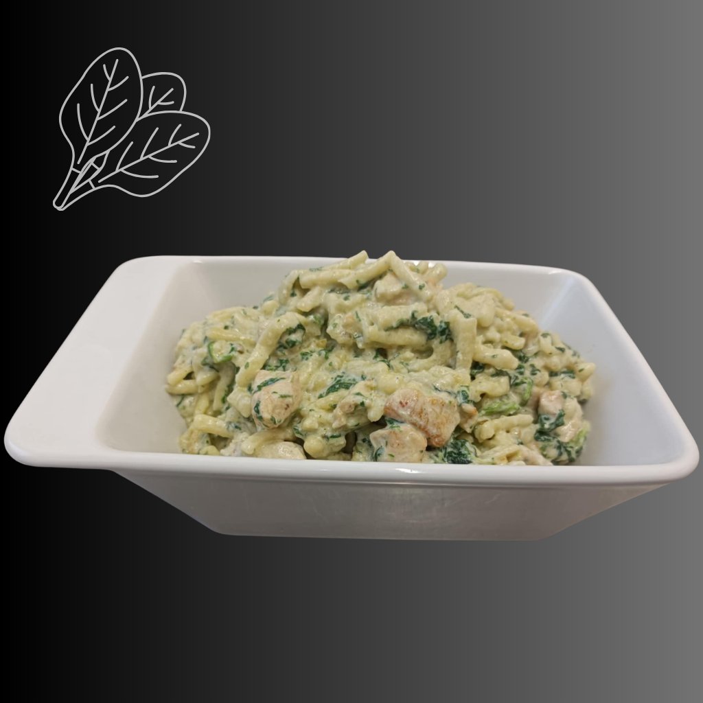 550g, špecle, kuřecí maso, sýr, niva, špenát, česnek, smetana