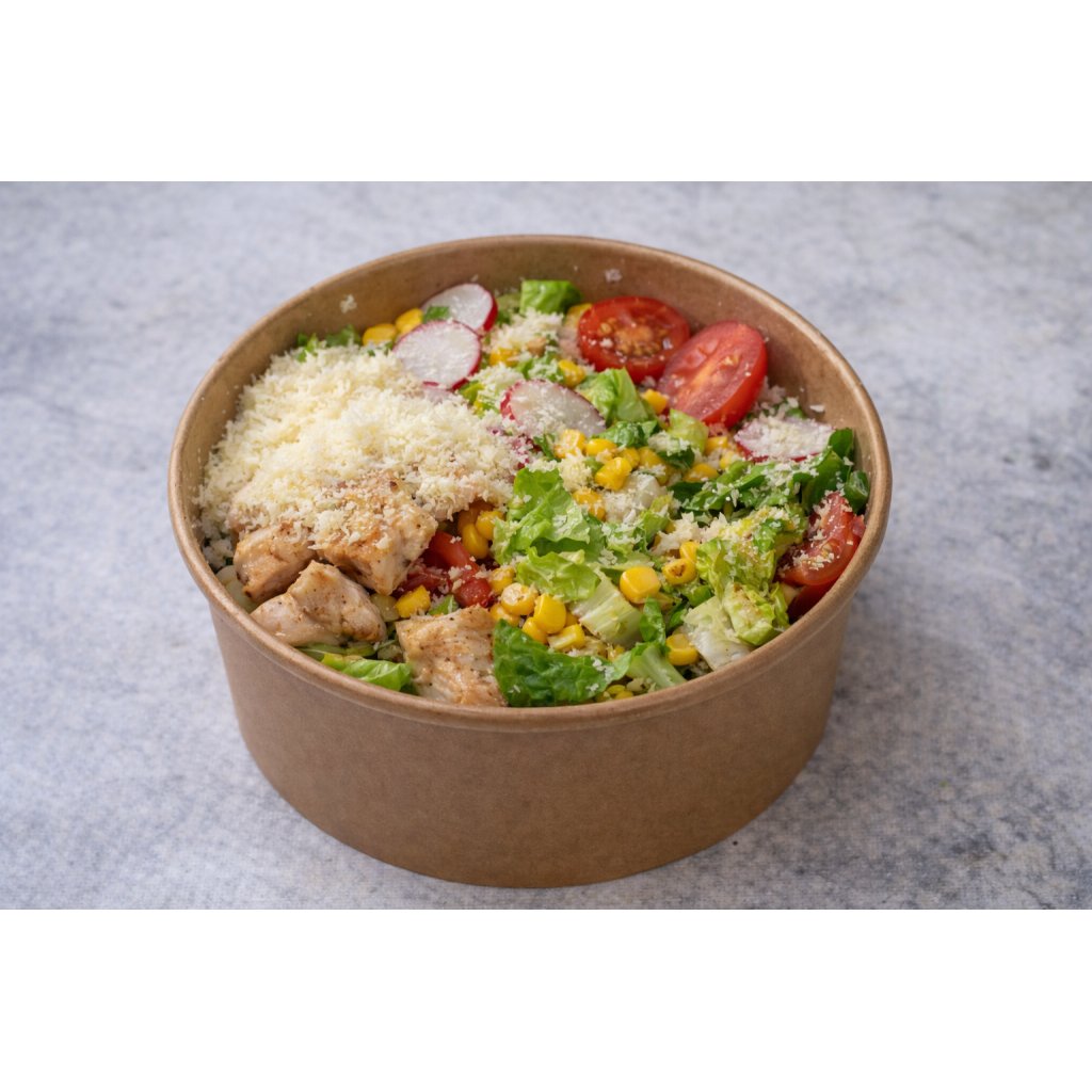 Salát, kuřecí maso, kukuřice, ocet, rajčata, ředkvička, parmezán.