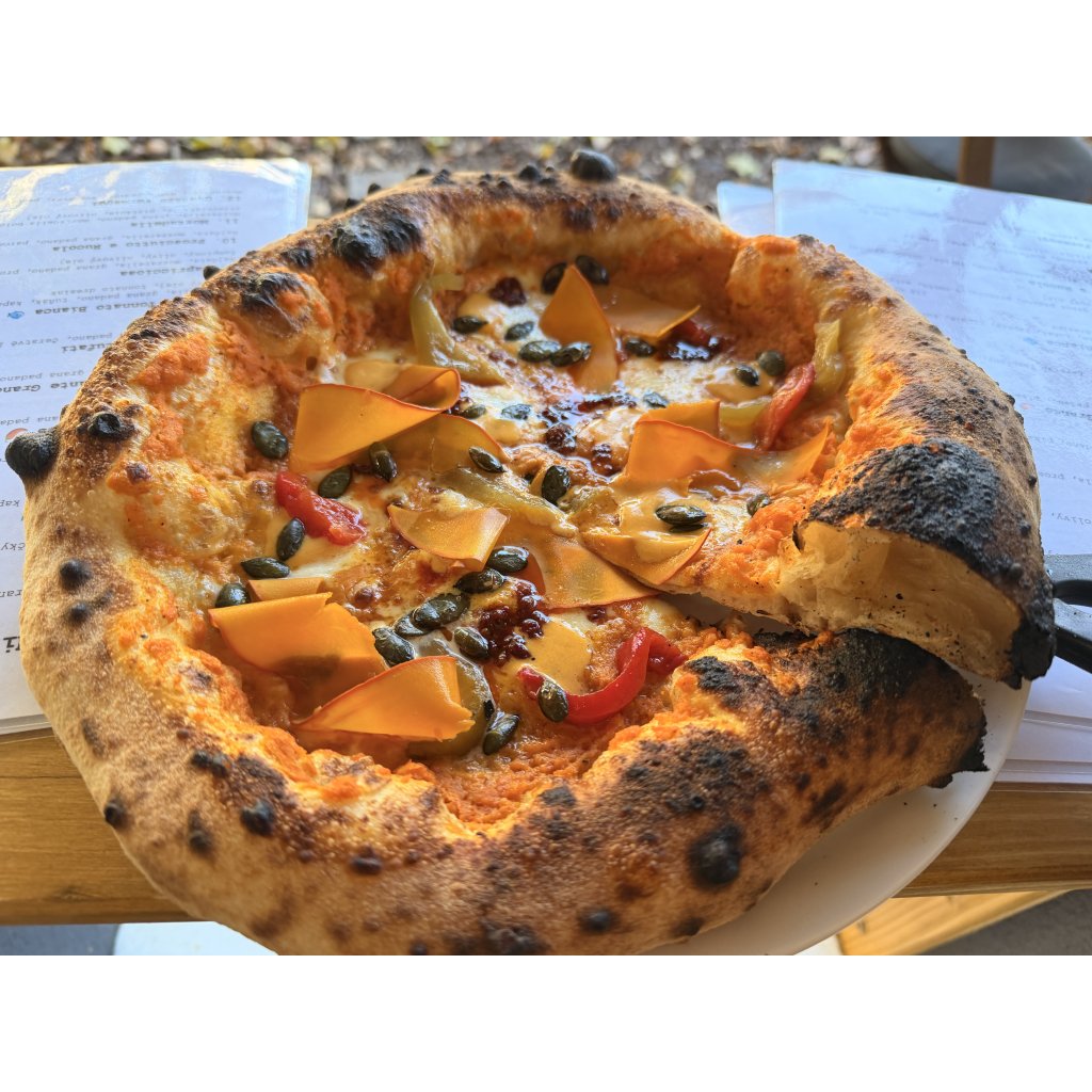 Dýňové pyré, mozzarella, Grana Padano, mascarpone s pečenou dýní a javorovým sirupem, ’Nduja, pražená dýňová semínka, nakládaná dýně. Sladká i pálivá – pravá chuť podzimu.